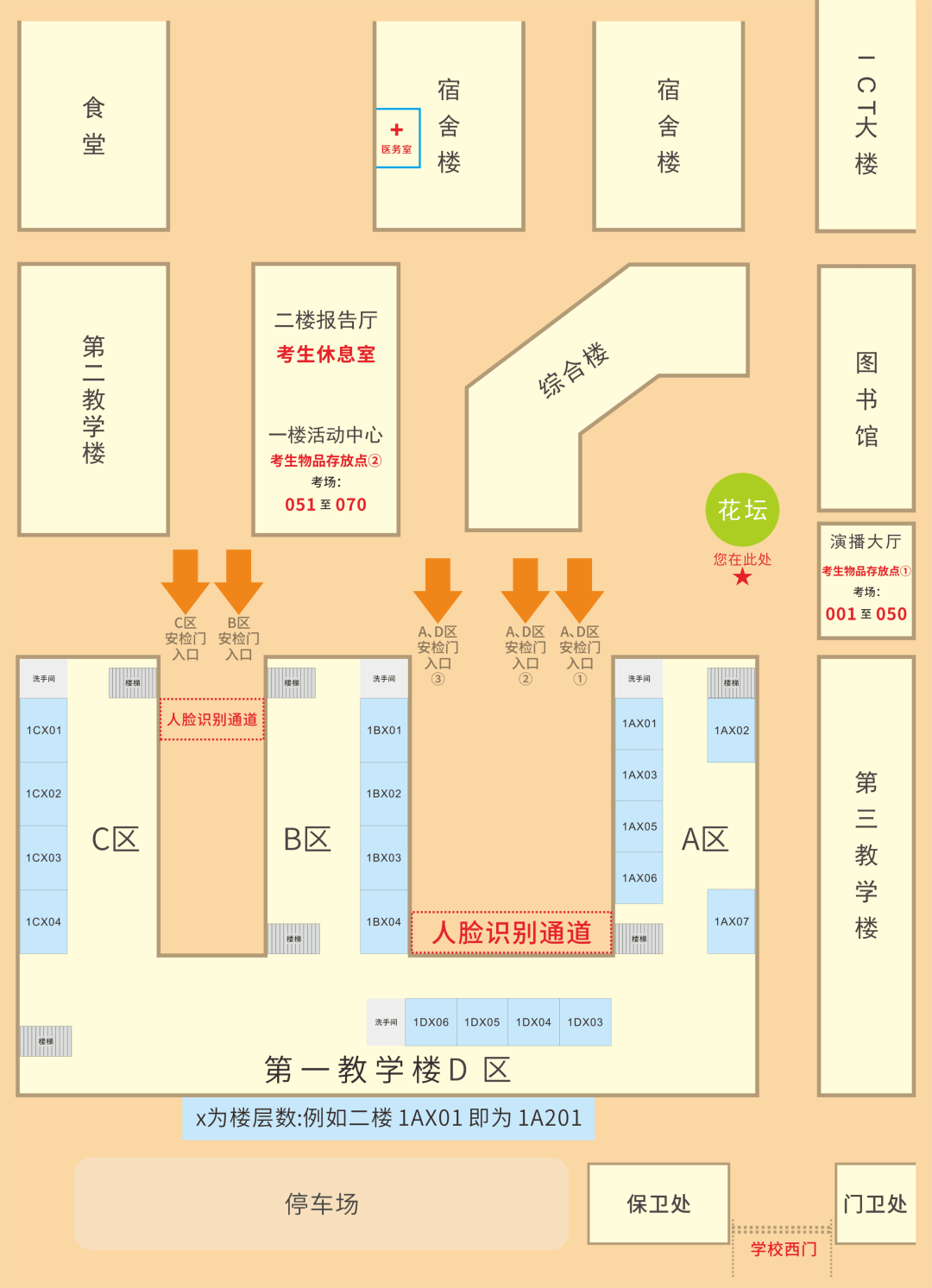 一、将报送门,途中留意平安并做好防雨办法,不答应社会车辆进入,请考生不要照顾具有通信功能的东西及具有存储、编程、查询功能的电子产物进入封锁区域(第一讲授楼ABCD区),别离位于花坛左侧演播大厅(考生物品存放点1 )及分析楼旁的勾当核心(考生物品存放点2)。